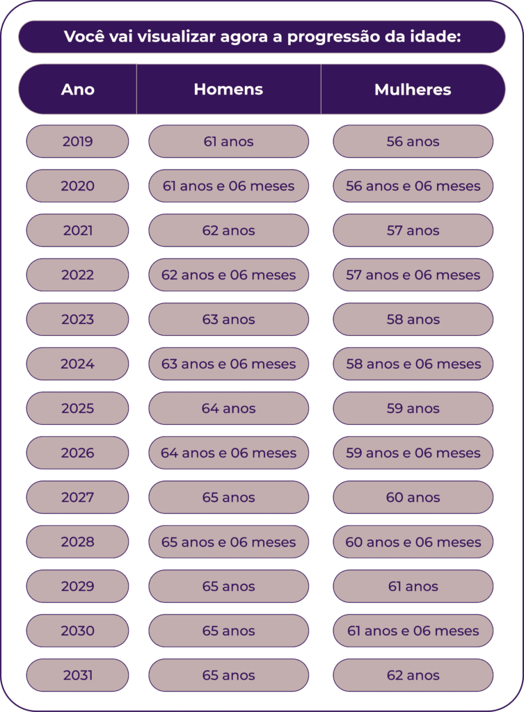 - A partir de 2020 o requisito da idade aumenta 06 meses por ano até atingir 65 anos de idade
