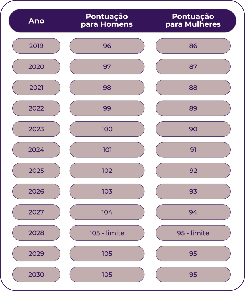 - 96 pontos + 01 ponto por ano a partir de 2020 até chegar em 105 pontos em 2028